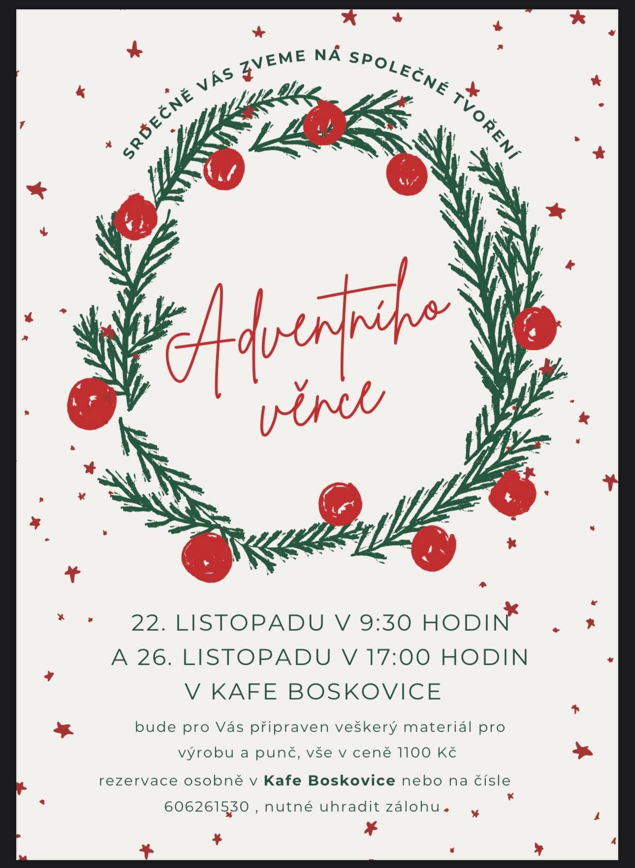 26. 11. 17:00 Tvoření Adventního věnce. Rezervace na čísle 606 261 530